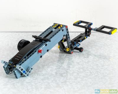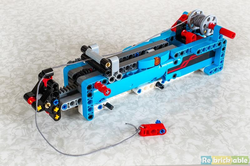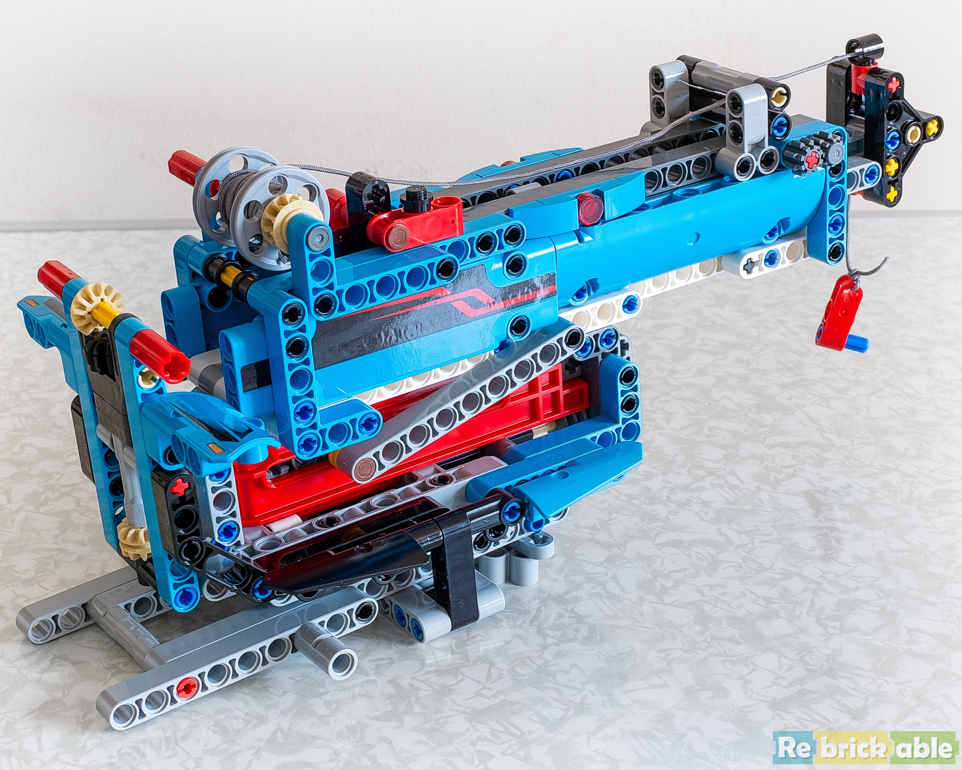 The completed boom has three functions. It raises and lowers utilizing the gear rack and housing. It can extend utilizing a gear rack, this time without housing. And it has a working winch. Conspicuously missing is a turntable, but you can still rotate the boom manually. This is an interesting decision by the designer, since opting for a rotating boom will mean it can inadvertently rotate while playing with the model.