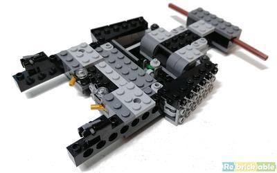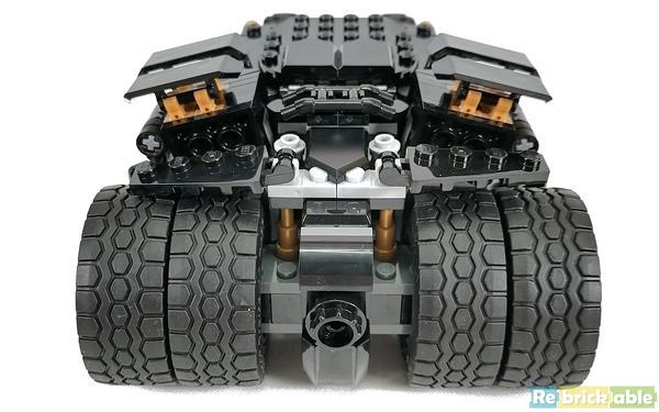 As for those light gray wheel caps, someone here on RB has come up with an incredibly simple and elegant solution: remove them (and the light stone gray Technic axle thingy that secures them), then remove the outside rear wheels and just flip them around. You instantly get a nicely muscular looking set of black wheel spokes. And if you align the outside wheels on the axle so that the spokes don't line up with those of the inside wheels, then you can't see through the wheel spokes, making the model look a lot like the real tumbler.
