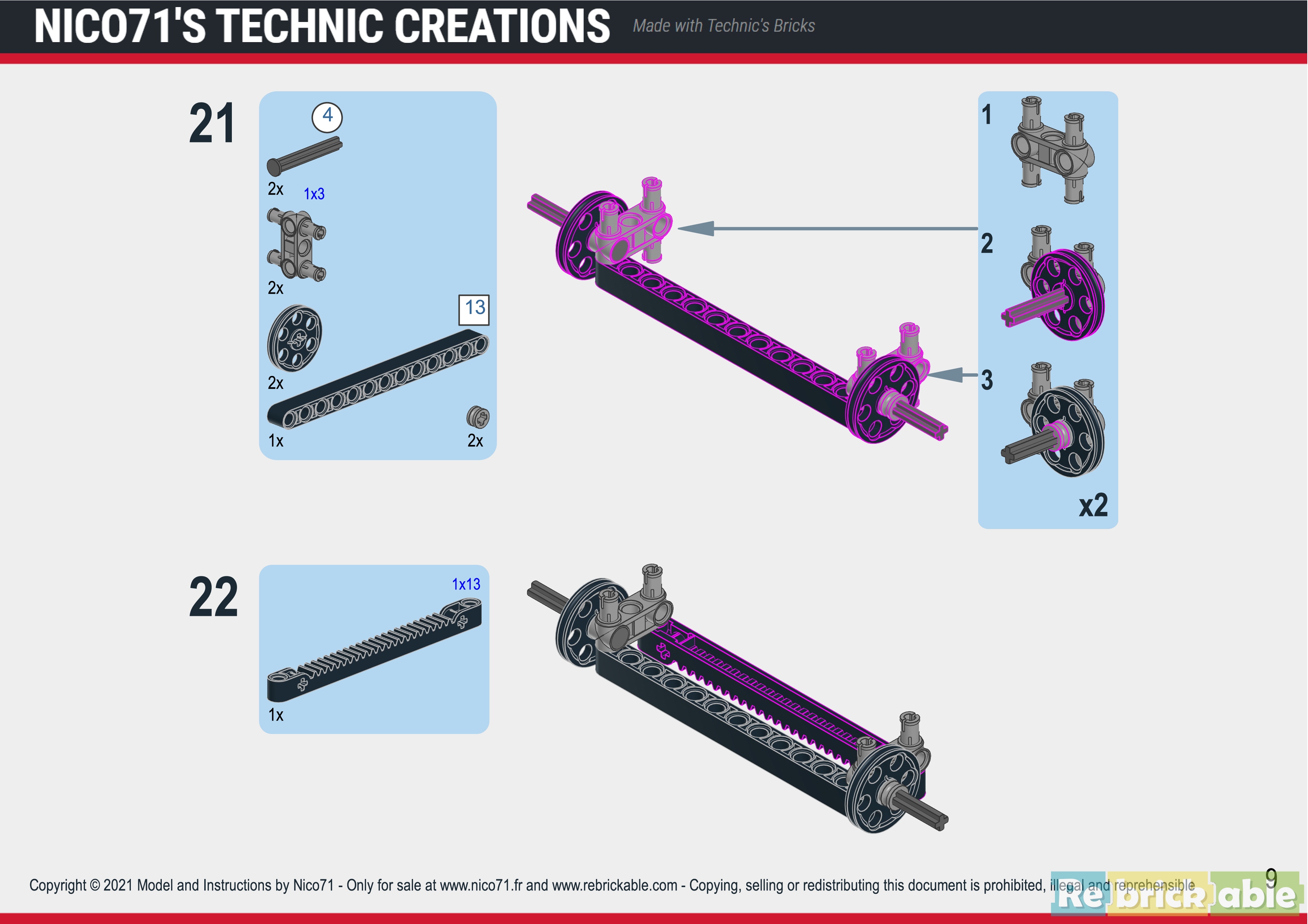Since I’m an Art Director IRL, I can’t help but comment on the aesthetics of the instructions. They’re easy to follow and are high resolution. I found the banner along the top and the red line along the bottom to be a little distracting. It’s not necessary to remind us on every page that this is “Nico71’s Technic Creations”. The purple highlighting and logical construction steps however, made this a very enjoyable building experience.