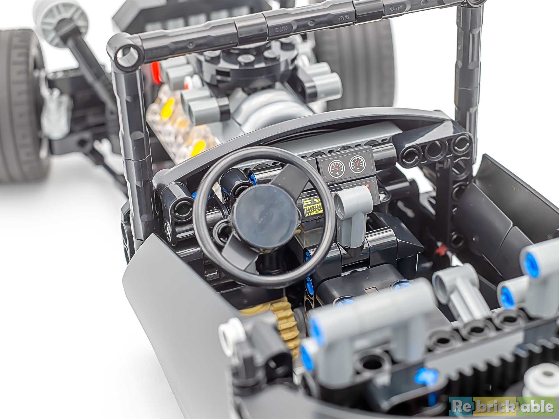The detailed interior looks very impressive. It features a working steering wheel (a very rare feature in official sets these days), levers that activate the light bricks, a dashboard utilizing the stickers from the official set, two beautiful dark gray seats, and functioning doors. I really appreciate the fact that the functions of the light bricks are all controlled within the interior of the car.