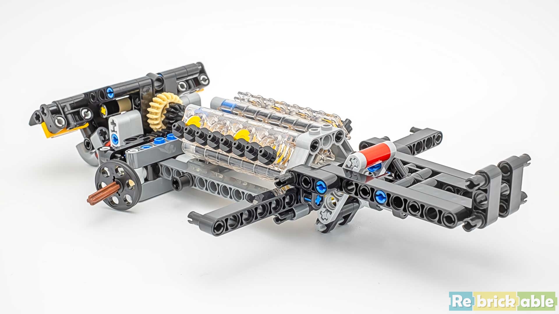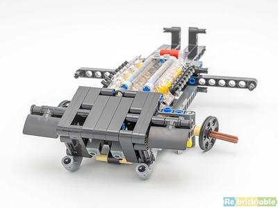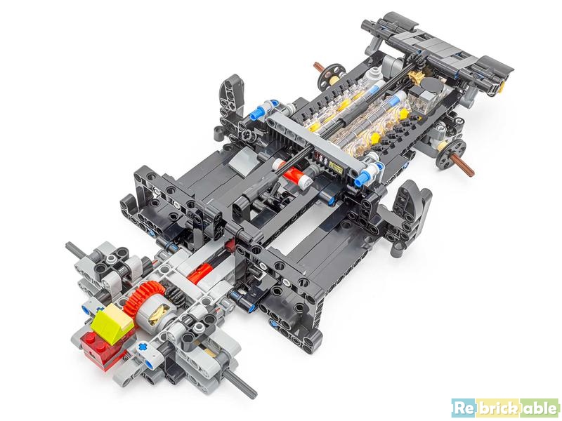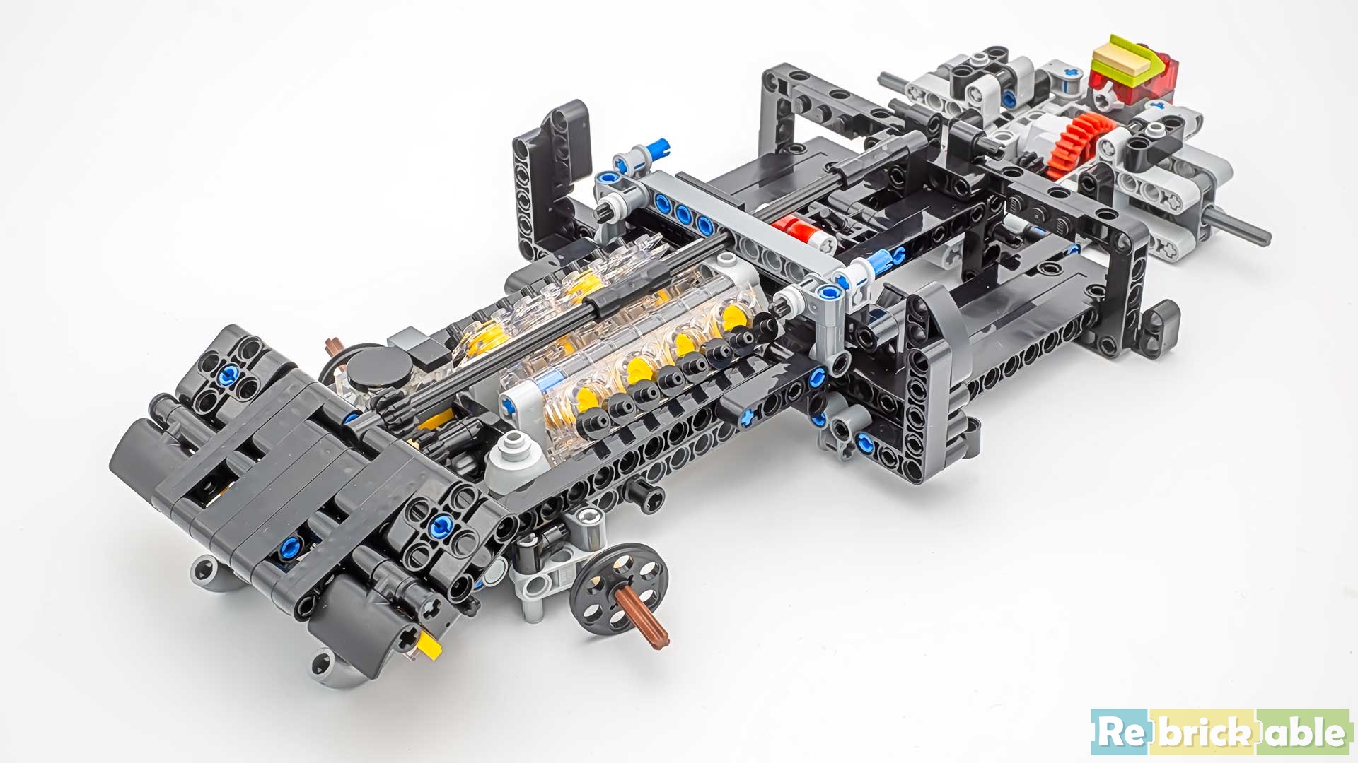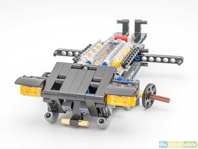 It’s always great to get into the meat and potatoes of the build right from the beginning. Here we already have the front axle which will be controlled by a HoG knob. There’s no hint of how just yet. Right behind it is the V8 engine that will be powered by the rear wheels. And the red lever, which isn’t functional yet, looks like it’ll control the headlights using a system of links beneath the engine.