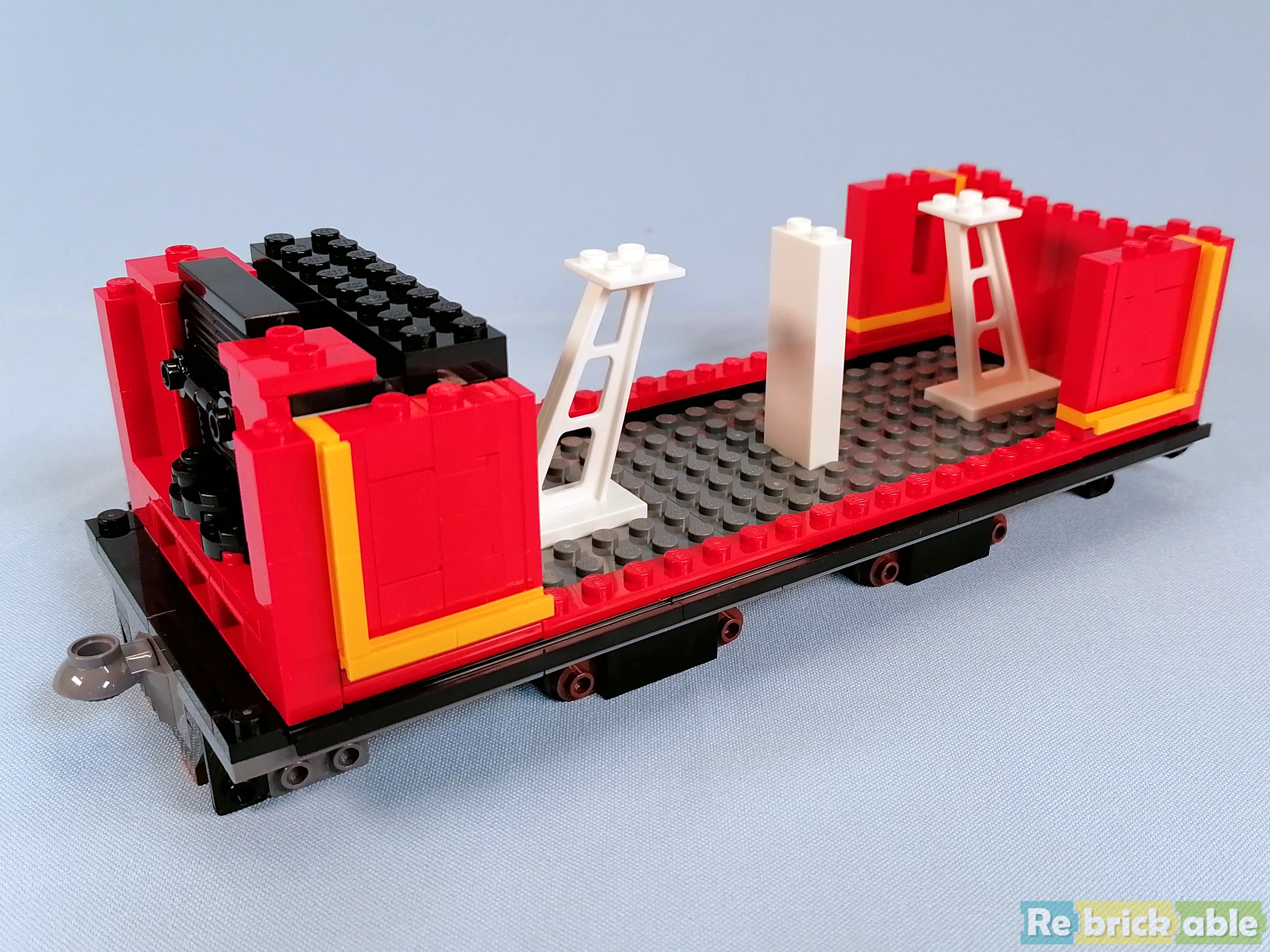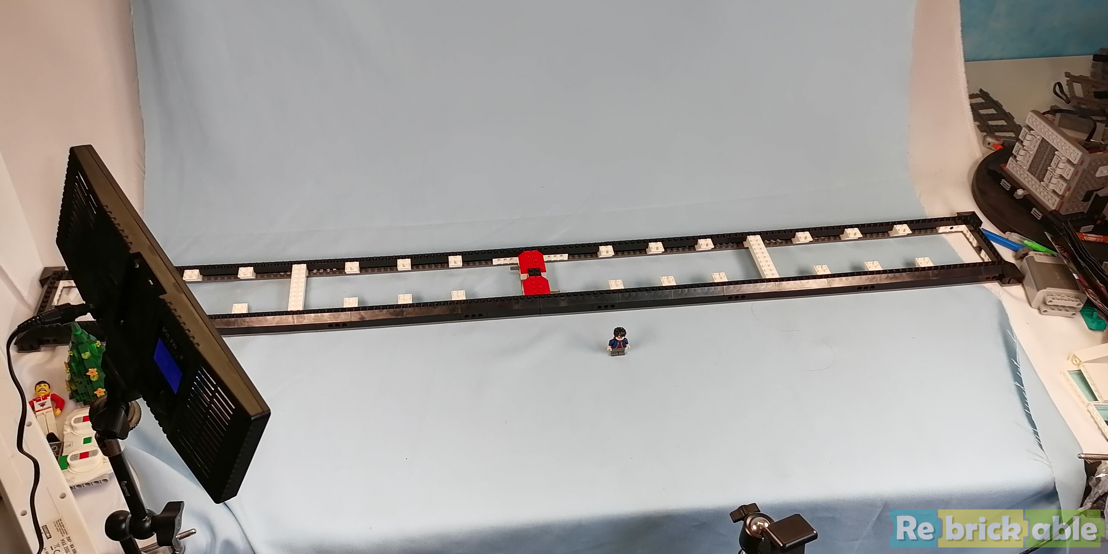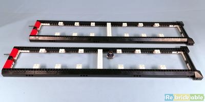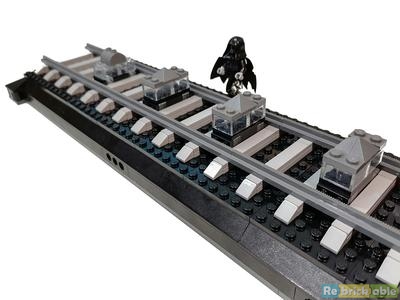 With the rails added we end up with a long track and rail beams that are 7 stud apart, 1 more than in the normal tracks. At one end, some bricks are added that hold the locomotive in place. This is the only section of the train that is held in place.