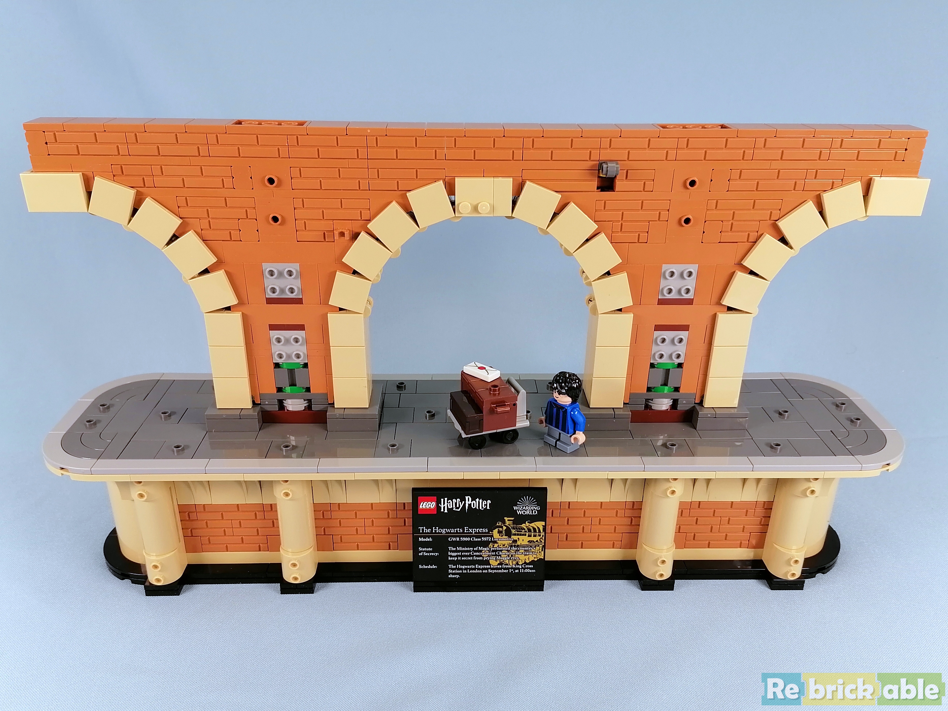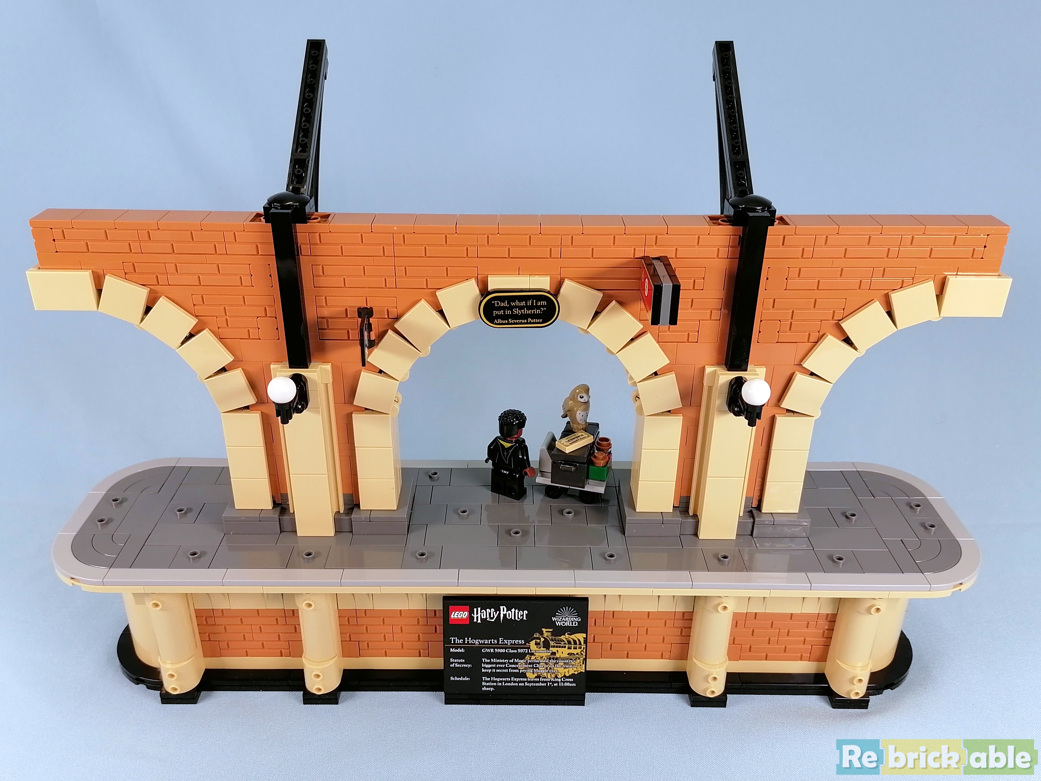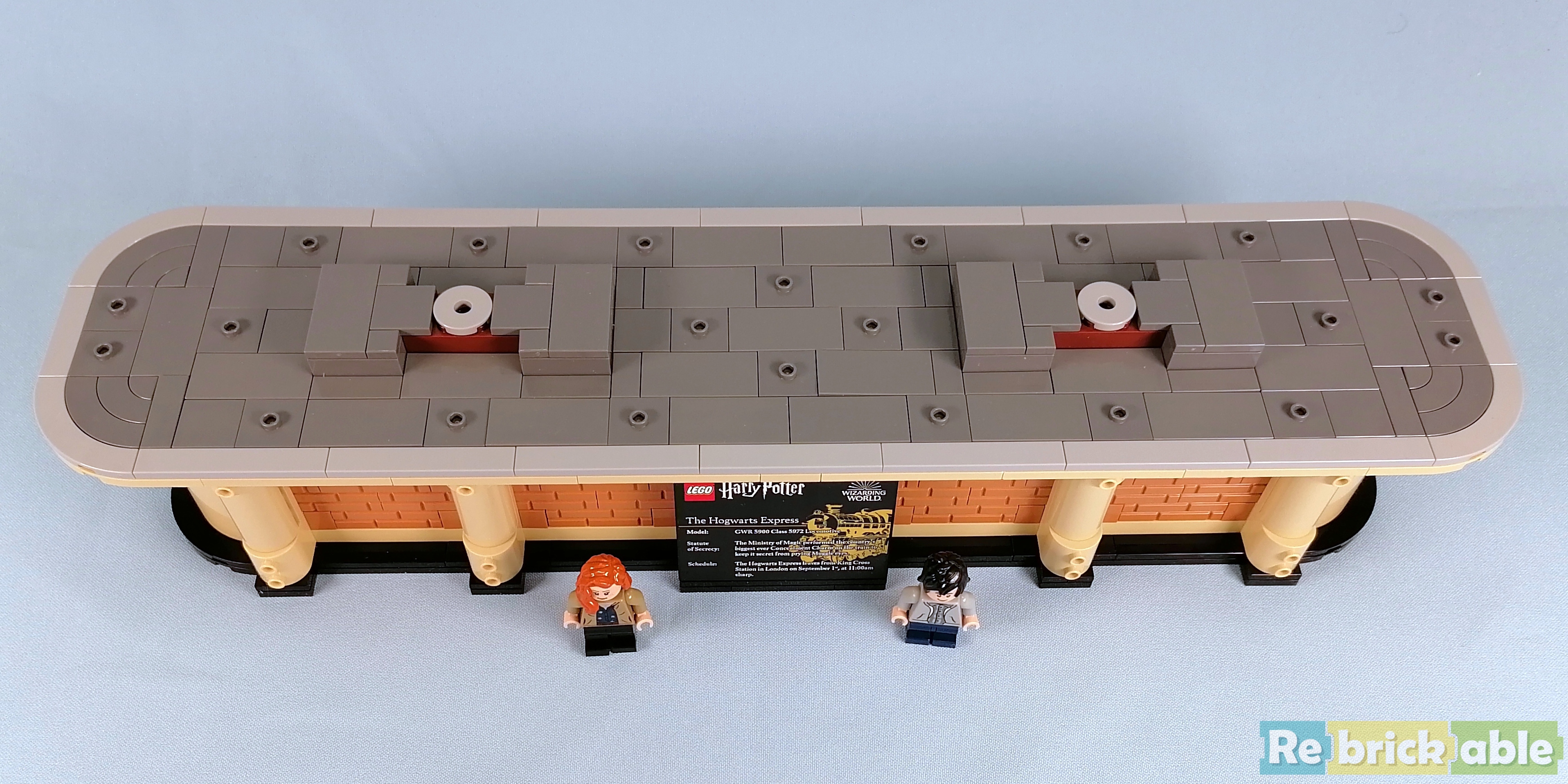 And last but not least: booklet 4 builds the station platform. Like the train, the platform is deceivingly large, spanning 40 cm. The base is beautifully decorated, and the top is completely tiled. The minifigs that come with the platform are 2 generic Hogwarts students and adult Harry, Ginny and their children.