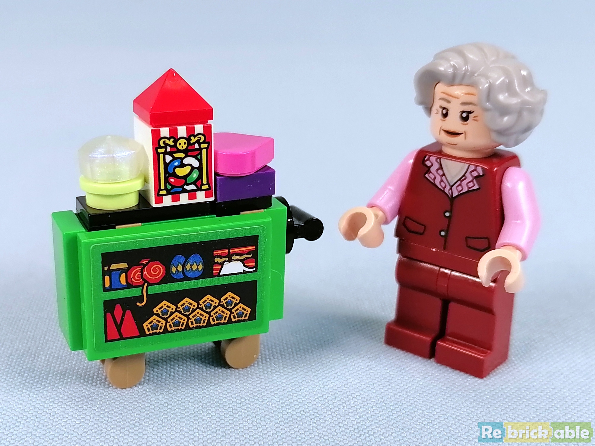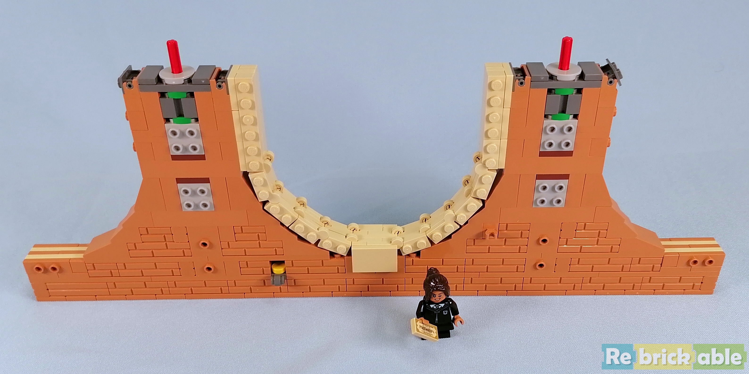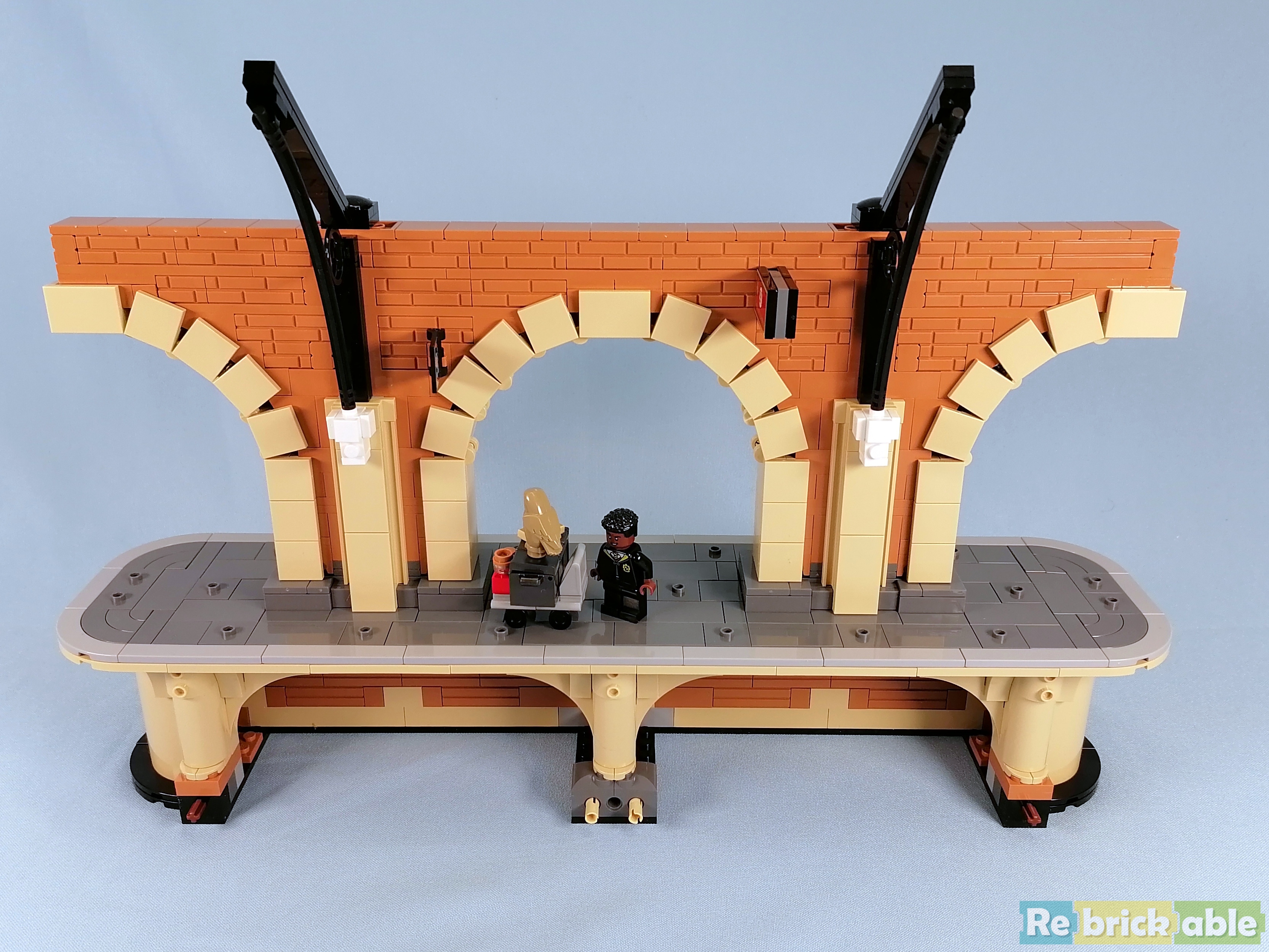 And last but not least: booklet 4 builds the station platform. Like the train, the platform is deceivingly large, spanning 40 cm. The base is beautifully decorated, and the top is completely tiled. The minifigs that come with the platform are 2 generic Hogwarts students and adult Harry, Ginny and their children.