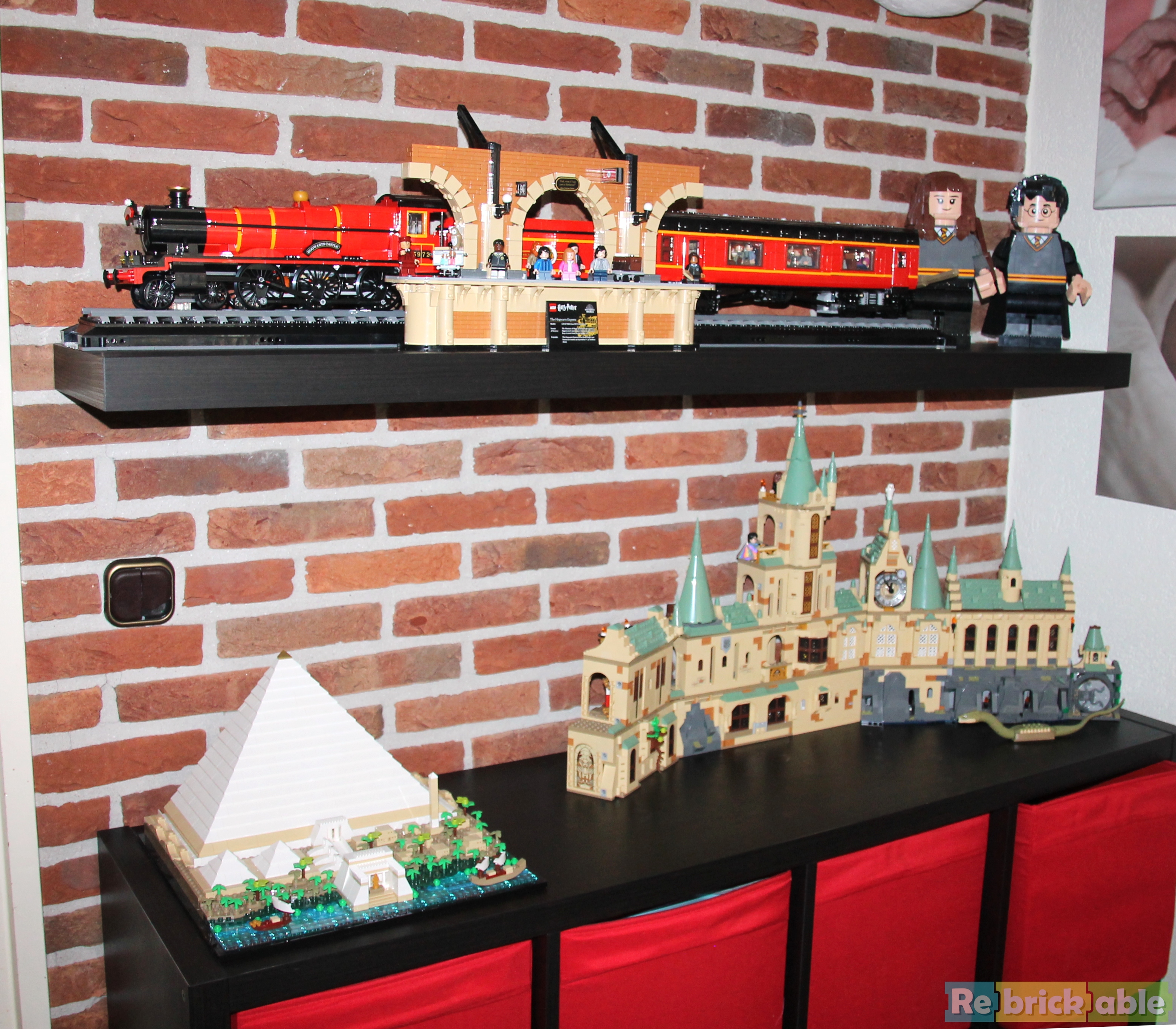 The finished build is beautiful to look at, and sturdy enough to even handle some play. Opening the panels can be done without constantly stuff breaking off, something that isn't always true for 18+ display sets. My SO even agreed on adding a new shelf above our KALLAX cabinet to display the train. The choice came to the LACK wall shelf from IKEA, fitting the model with some room for other Harry Potter sets, and sporting the same color and finish as the cabinet. I did have to cut a bit off to make it fit on the wall.
