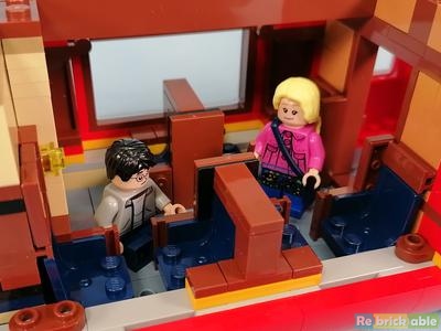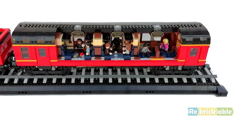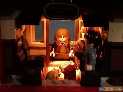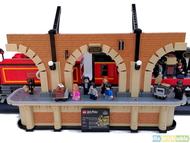 Authentically detailed inside and out The engine features a detailed underside and a lever on the top that causes the train to rock with the motion of a steam train. A tender car carries the engine’s supply of coal. The passenger car comprises 3 compartments, each depicting a classic scene: when Harry, Ron and Hermione meet in the series’ first movie; when Professor Lupin saves Harry from the Dementor™ in the third movie; and when Luna saves Harry from Draco's spell in the sixth movie. The model also depicts Platform 9¾ at King’s Cross Station, where the adult Harry and Ginny wait with their children, Lily, James and Albus, ready for Albus’s first trip aboard the amazing Hogwarts Express. From LEGO.com
