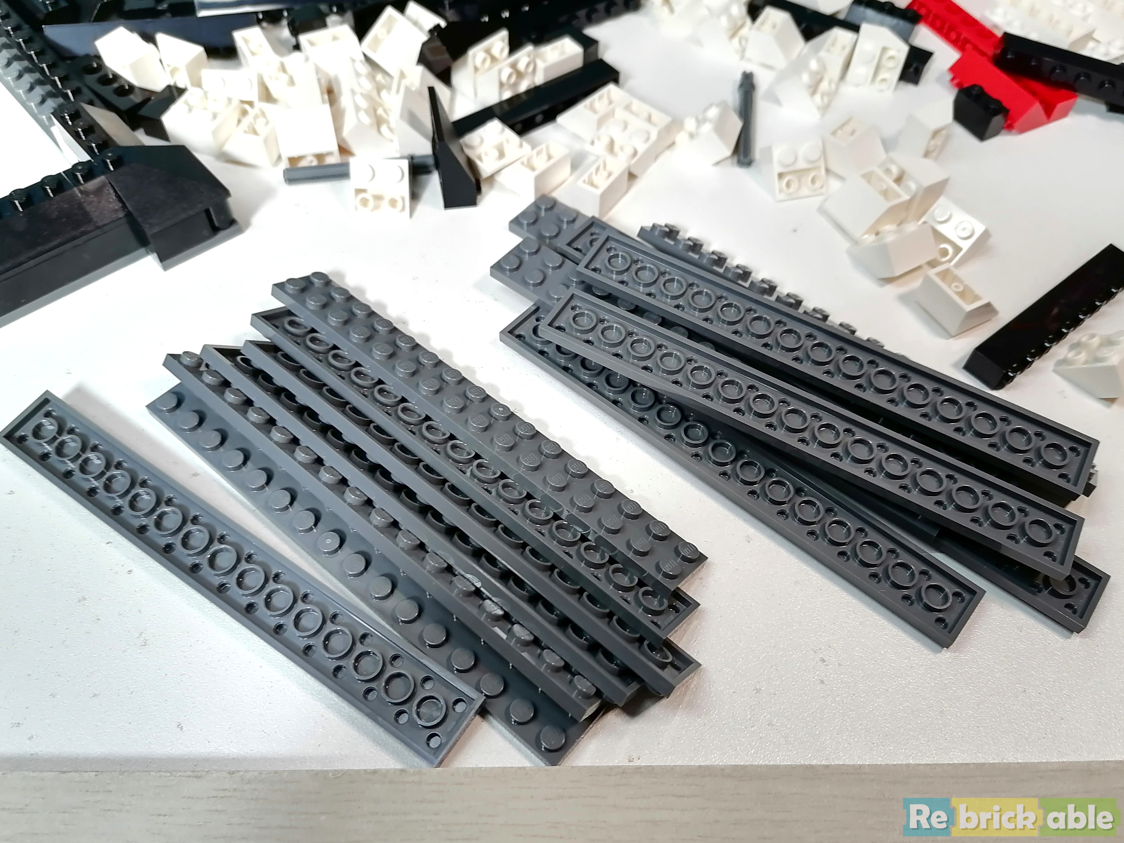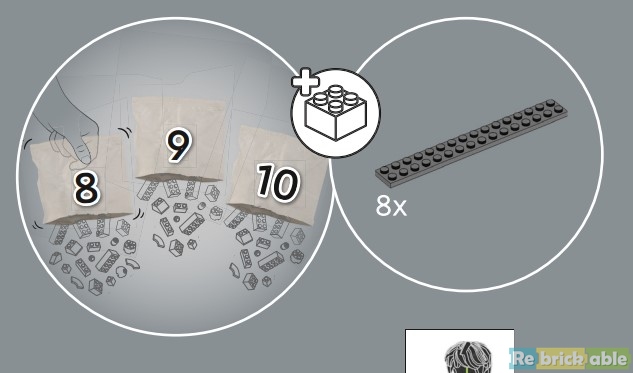 On to book 2, which starts with the rails. As I mentioned in the The Box section, all bags have a unique number. As it turns out, the stages are no longer limited to 1 unique number. For the first stage of the rails, I need to open 3 bags: 8, 9 and 10. TLG got the feedback that some builders get confused when there are multiple bags with the same number. They often think they are missing parts because they open only one bag. I assume this new numbering system is introduced to combat the confusion, but I have not been able to get a confirmation from my sources yet. What is weird, is that I also need to take 8x Plate 2 x 16 from an unnumbered bag. Not really weird, it happens more often that larger parts are bagged separately. But in this case, bag 8, 9 and 10 also include 8x Plate 2 x 6, bringing the total for this stage to 16. Why not pack them all in the numbered bags?