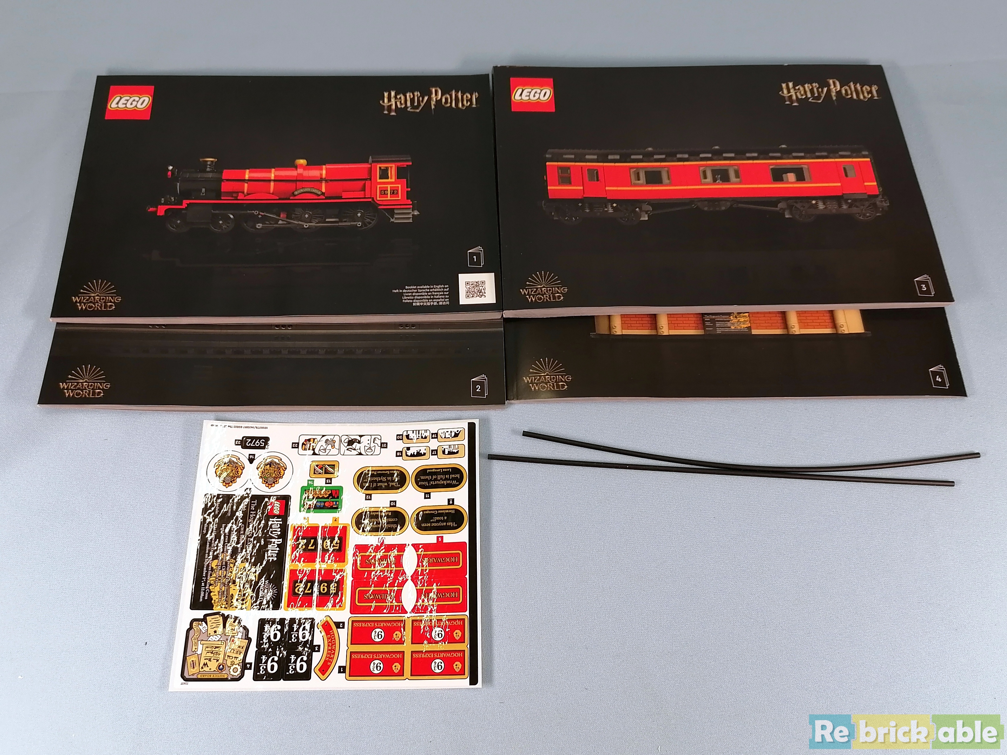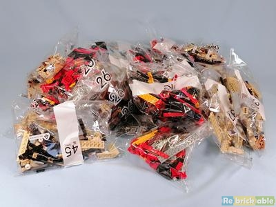 The box measures 520 x 482 x 216 mm and weighs 7260 grams. Inside we find a pile of bags, and an inner box with even more bags and a paper sleeve containing a sticker sheet and 4 building manuals. The instructions are split up. Manual 1 builds the locomotive, manual 2 the coal tender and rails, manual 3 the passenger cart, and manual 4 platform 9 3/4. The pdf can be downloaded here. A quick count shows there are 2 unnumbered bags and 45 bags numbered 1 through 45, so one for each number. The weird thing is that some bags seem pretty small to cover a complete stage, but more on that later. I'm a bit dissapointed to see so many stickers in a set in this price range.