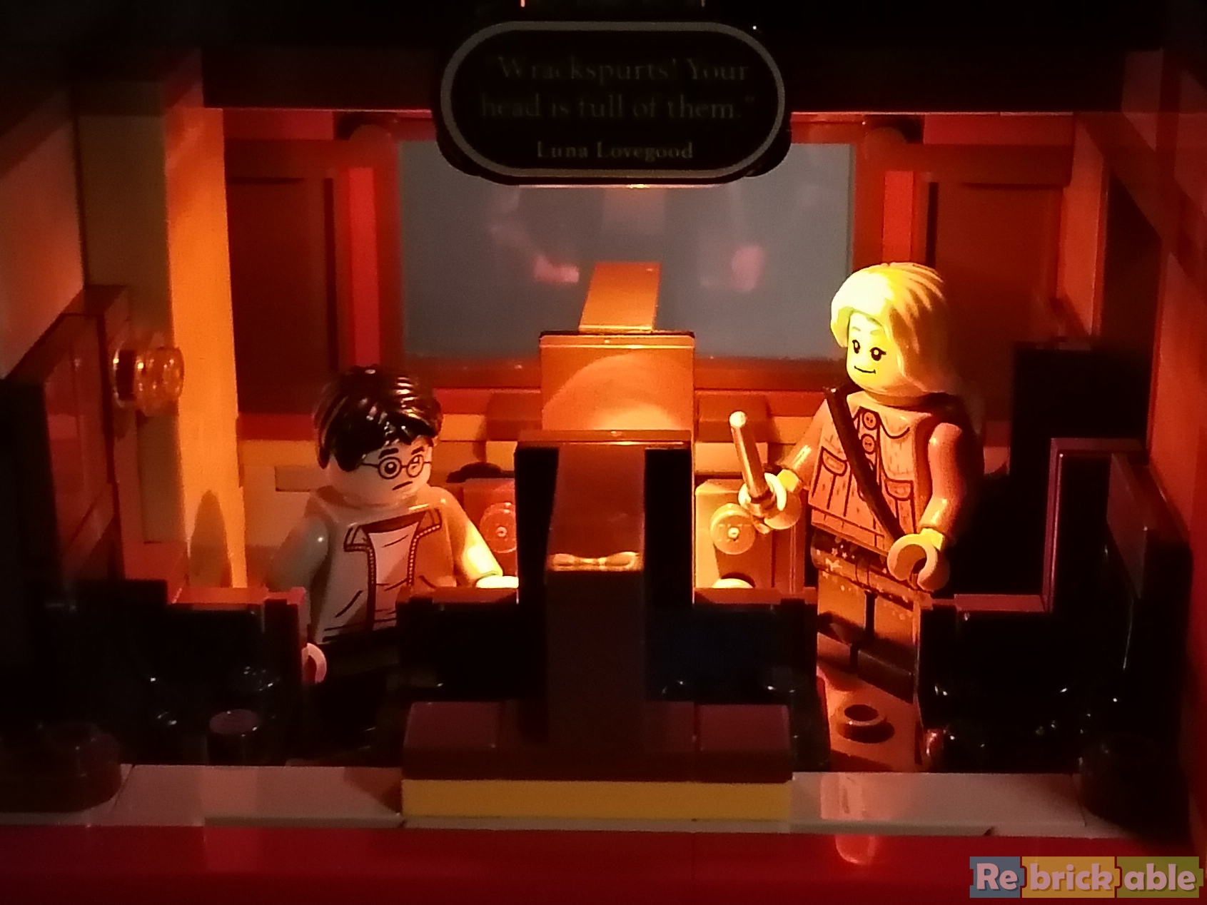 Then, we introduce the minifigs created in the previous stages. The first compartment shows Hermione meeting Ron and Harry in the first movie. The second shows the dementor searching the train in Prisoner of Azkanban. The larger seating area shows a scene from The Half-Blood Prince, which I haven't seen yet.