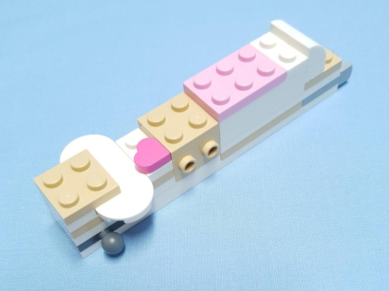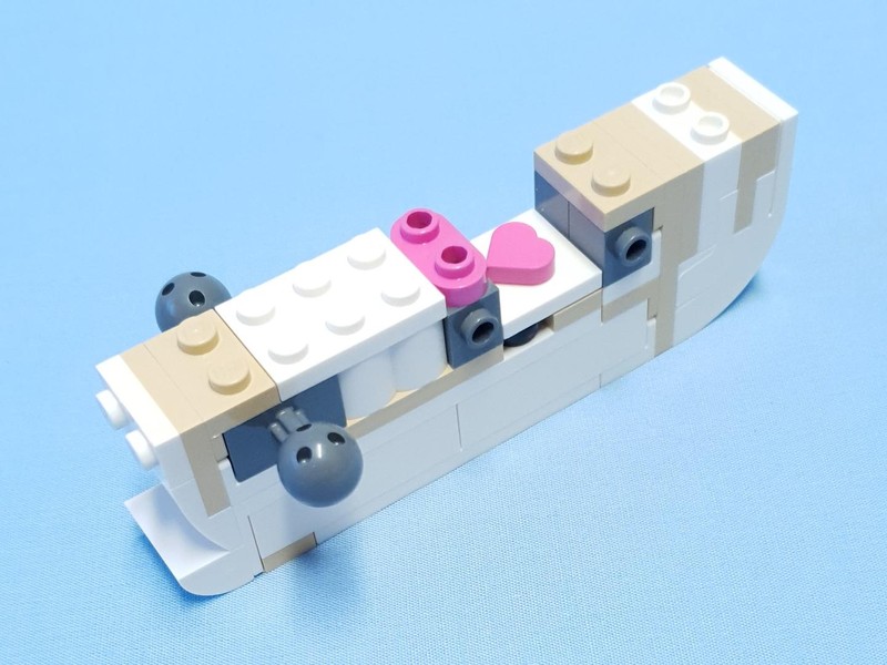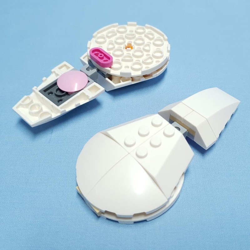 I will start with the main model. We start by building up the body. One cute detail is that a small heart piece is placed inside located roughly where the heart would be. Internal pieces are a great place to hide pieces needed for the b-models. In this case 3 turntables are needed later on, and we can see one is tucked away in the body above the heart, the other two get hidden in the cheaks later. While b-models do not need to use all the pieces, typically the main model does.