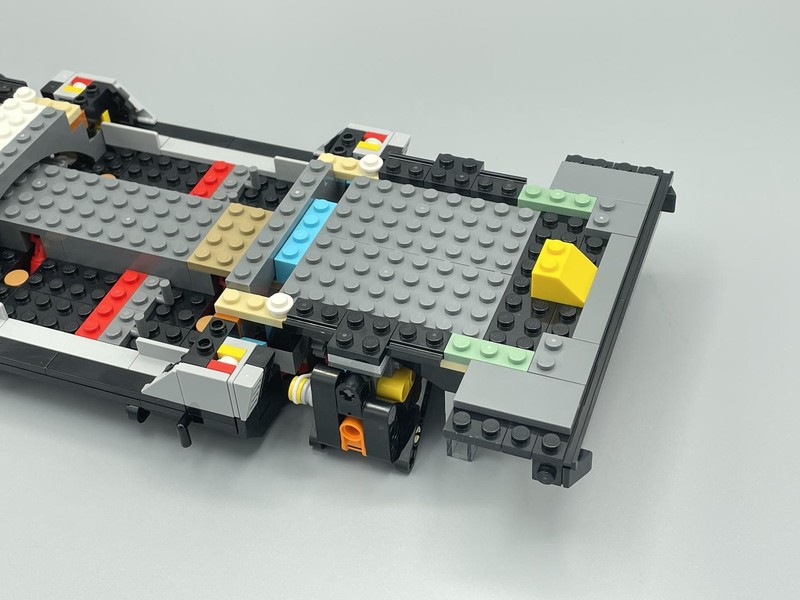 When I was placing the side sections I thought I was going crazy. To achieve the odd wheel arches you have to sit the parts on only half a stud. I spent a minute trying to get the part fully in before I realized I was being an idiot. Even though there is no clutch at the center of the wheel arches the support is enough making the 10 studs long span more than strong enough.
