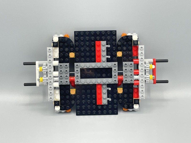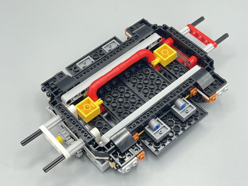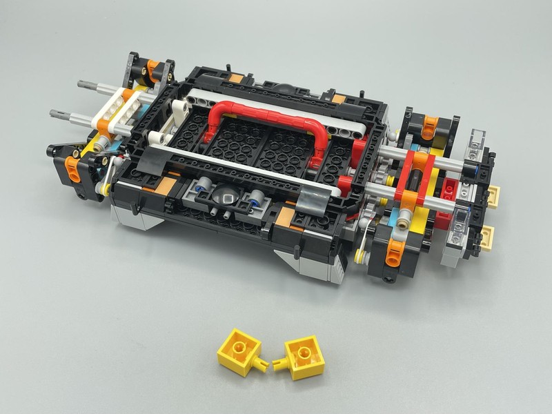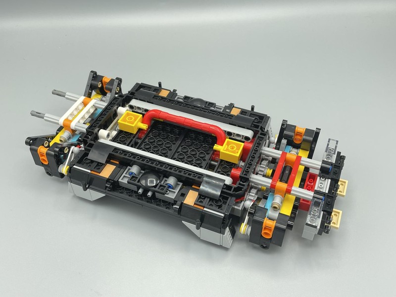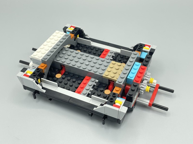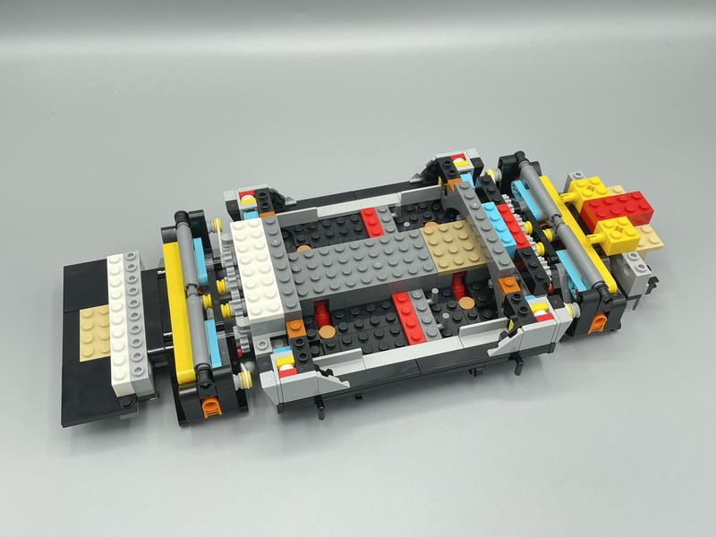 The chassis is interesting because of the lack of structure from left to right. Often builds like this use Technic Beam squares but here it mainly relies on plates to give it sideways strength. Underneath there is a large red lever which is then pinned down with Yellow 2x2 Brick w/pin. Presumably these are removed later to allow the lever to be useful.