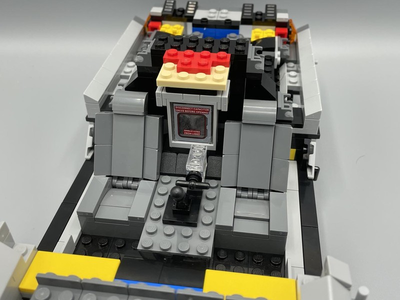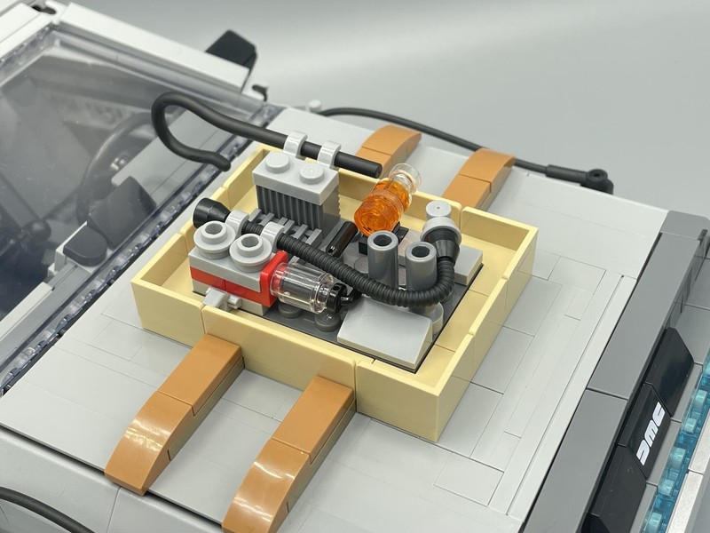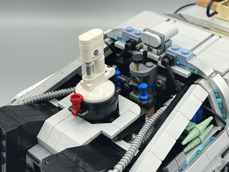The version uses the same Mr. Fusion build as Part II, however there additional more significant differences. The hood is built so SNOT bricks are facing up to allow you to attach the customizations made to the engine in the movie. Also the wheels are replaced with White hubs (not pictured because I couldn't be bothered to remove the tyres) and red and silver dishes to recreate the hubs of the future.