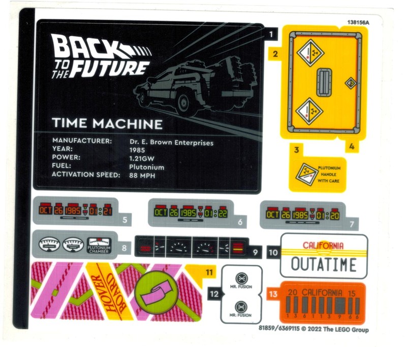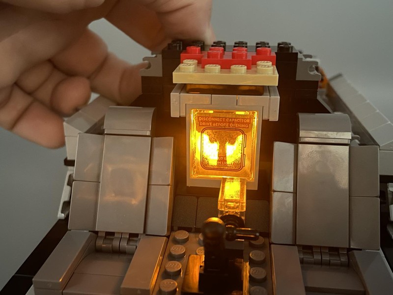 The flux capacitor is created here using a window, a sticker, a grappling hook, and a light brick. Obviously I would've preferred a printed part for such an important piece, especially since they had to make a second sticker sheet especially for the transparent sticker. But the end result looks good enough. I really appreciate the addition of the light brick.