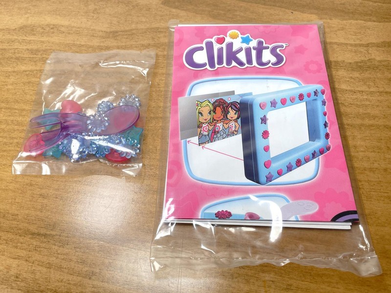Inside is 2 bags, one contains the instruction manual, legal battery information, the sticker sheet, and the spare large frame inserts. The other contains all the Clikits icon and accent parts. On a separate cardboard tray that you have to rip open is the frame which has a bunch of Icons pre-installed on the frame and some more inserts.