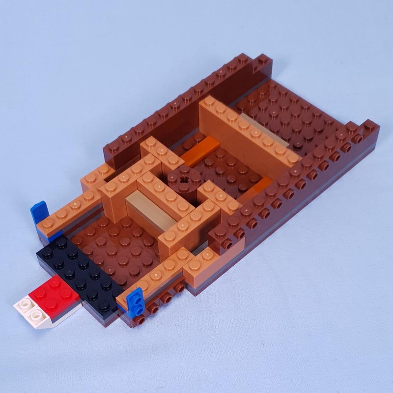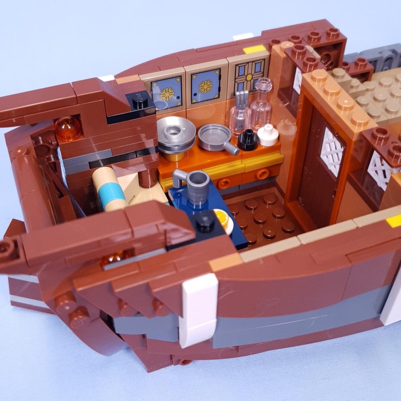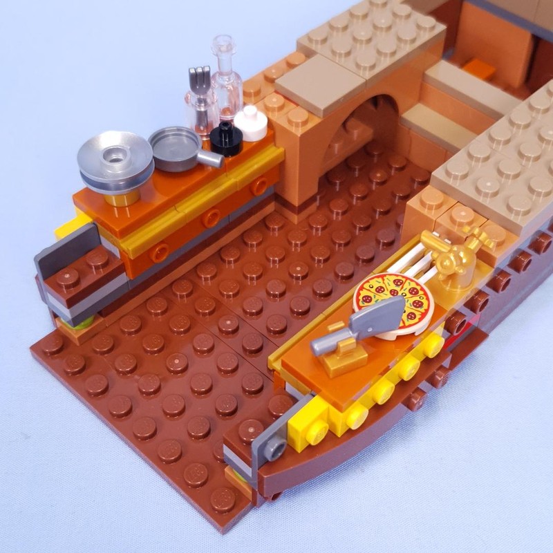 Up the back of the ship a cluttered kitchen is constructed. Given how much Luffy enjoys eating, it makes perfect sense that this is what the internals are focusing on. However, it does have the same issue that many minfig kitchens fall into, it is hard to make detailed cabinets that are the right height. The benchtops are almost up to Zoro's shoulders (using Zoro instead of Sanji purely because he was the only one built by this point). I was hoping the floor would be padded out with a layer of tiles to help make it slightly less ridiculous, but no, this is it.