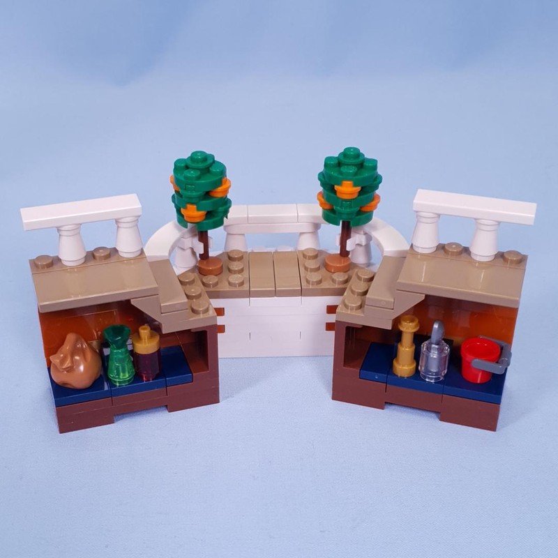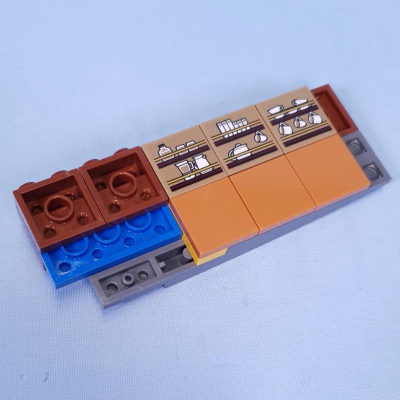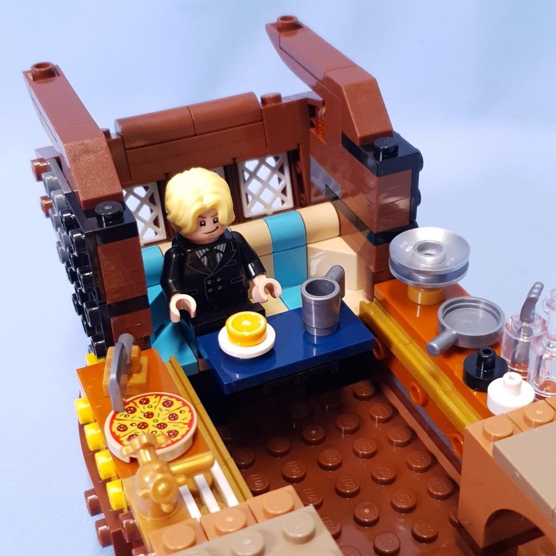 The back section is attached at an angle, don't worry about the gaps, they get covered up nicely later. This creates a nice breakfast nook for two minifigures, with an orange slice (thanks to Nami).