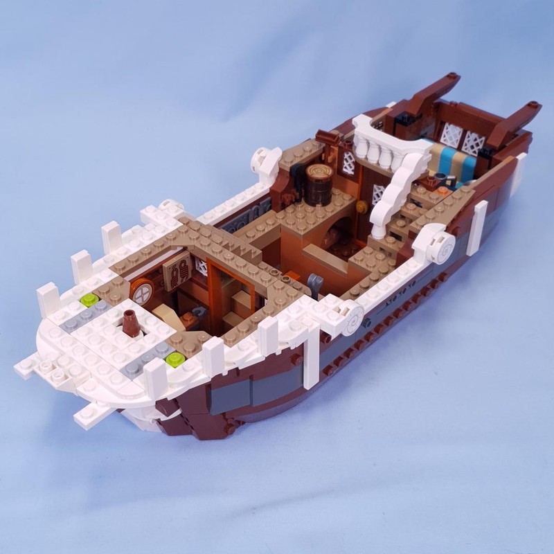 This is a fun-sized build of a fun pirate ship. It is large enough to get a good amount of details, but small enough to still be affordable. The exterior of the ship matches quite well to the source material. Compared to the larger versions of the Destiny's Bounty, or the recent 10365-1 - Captain Jack Sparrow's Pirate Ship, the Going Merry will feel comically small. But honestly I am a bit over the massively huge sets, and have come to appreciate builds that are easier to find shelf space for. Below you can see how the size compares to my slightly modified 70618-1.