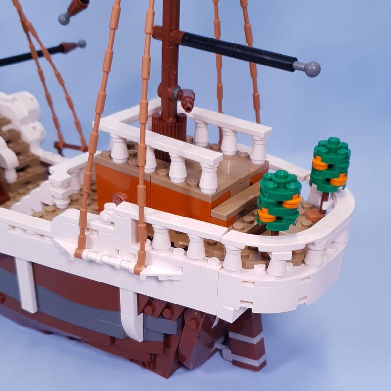 The iconic ship has several interior spaces: a crew’s cabin, kitchen, storage, and an accessory workshop. The model comes with 5 LEGO ONE PIECE minifigures. Luffy sits on the sheep figurehead at the front of the ship, below which is a cannon; Zoro relaxes and trains on the deck; Nami controls the rudder at the rear, where her favourite tangerine trees grow on the deck; Usopp climbs the masts and keeps watch from the crow's nest; and Sanji takes pots down the stairs to the kitchen. Includes 4 'Wanted' posters.