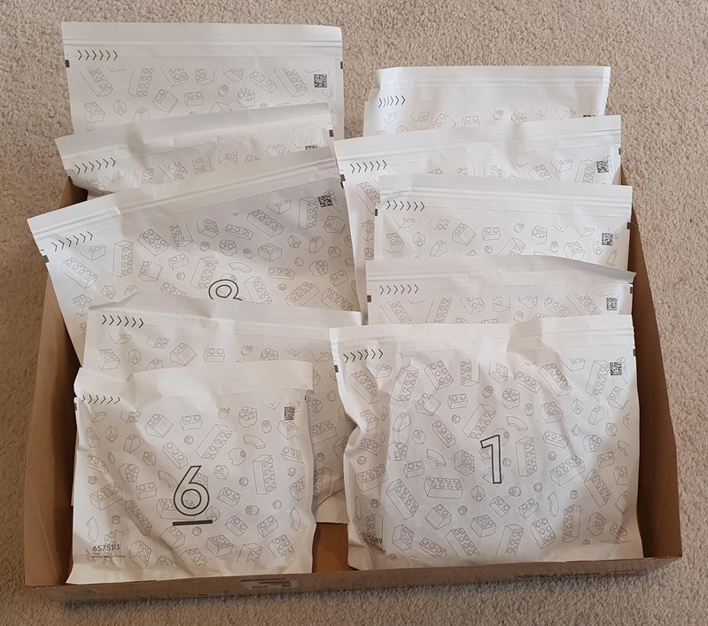 The box measured 378mm x 480mm x 94mm and weighs 1.95kg. Inside are 10 paper bags numbered 1 to 10, one plastic bag with some long flexible parts, the larger sail sheet, and one paper evnelope containing one instruction book, the smaller set of flags, and one sticker sheet. The box is a lift off style, which gives a nice space to organise the bags.
