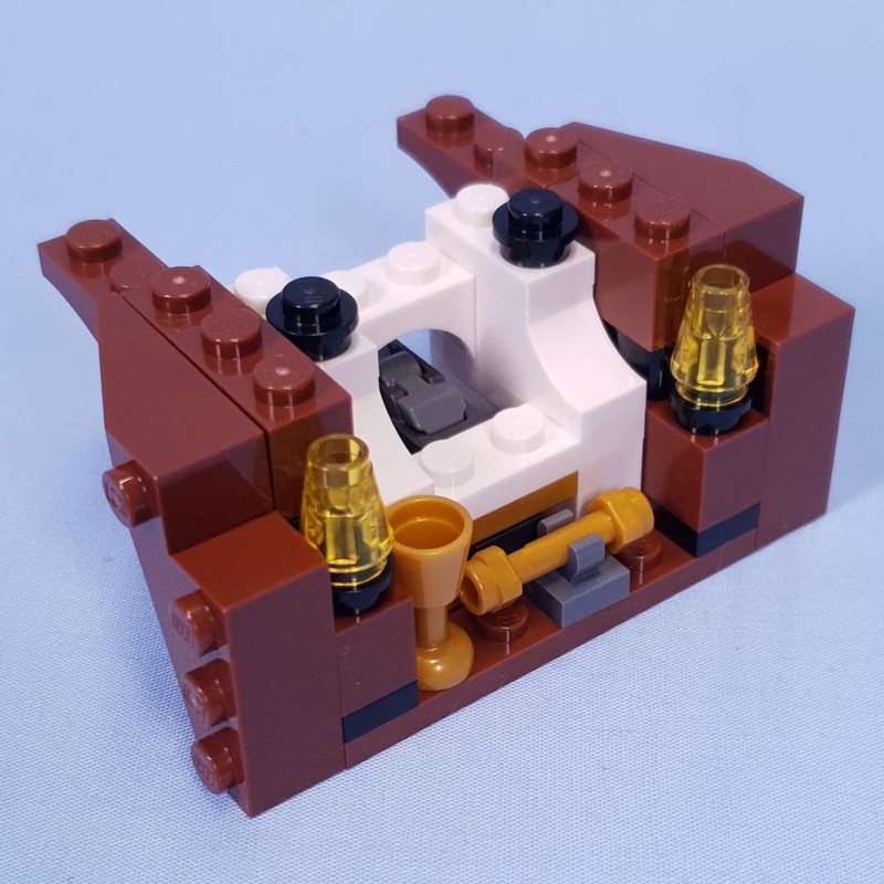 The room at the front of the ship is quite small and has a stud shooter built in. This can be triggered with the button on the deck. We start adding some while balustrades. I'm not sure of the rellevance of the cup and gold bar. Just some pirate treasure?