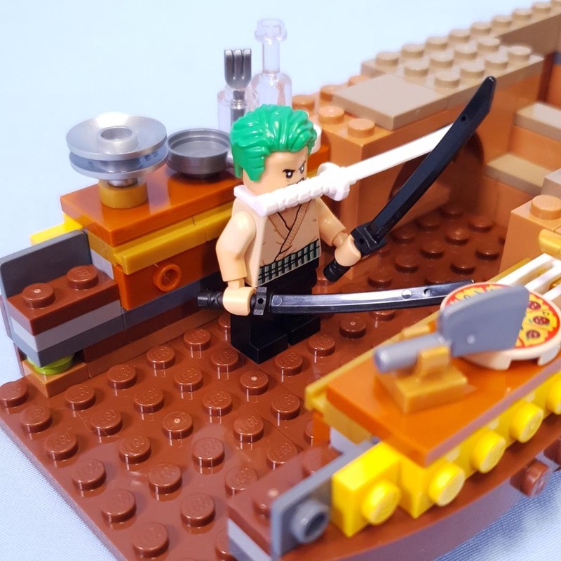 New parts are mostly minifigure related, with quite a few new/rare reddish brown parts for the brick built hull. I was wondering how they would do Zoro's mouth sword, the accessory is able to clip on and off without removing Zoro's head which is nice and convenient for play.