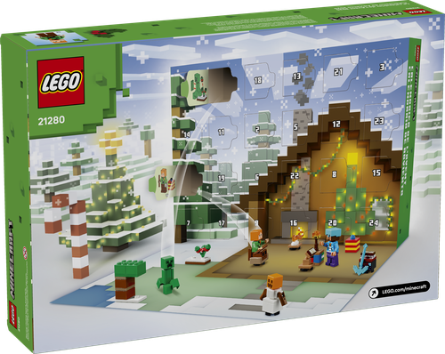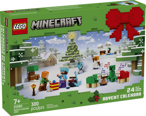 The LEGO® Minecraft® Advent Calendar 2025 (21280) has 24 days of buildable Christmas gifts, LEGO minifigures and video game collectibles for kids and fans of the Minecraft game aged 7 and up. Behind each of the 24 doors is a daily gift for kids todiscover throughout the buildup to Christmas. Minifigures include Alex wearing a Creeper™ sweater; Steve wearing a snowman sweater and diamond helmet and holding a pickaxe; a Creeper by a sweet berry bush; a drowned with a trident; a stray with diamondarmor; a snow golem; a zombie with an enchanted axe; and a Santa villager with a furnace. There are also lots of small building toys and cool accessories that kids will recognize from the popular game. As the big day approaches, kids can combine the gifts to create a Minecraft micro winter village set and endless imaginative adventures of their own. There’s even a fold-out playmat to provide the perfect backdrop. From LEGO.com