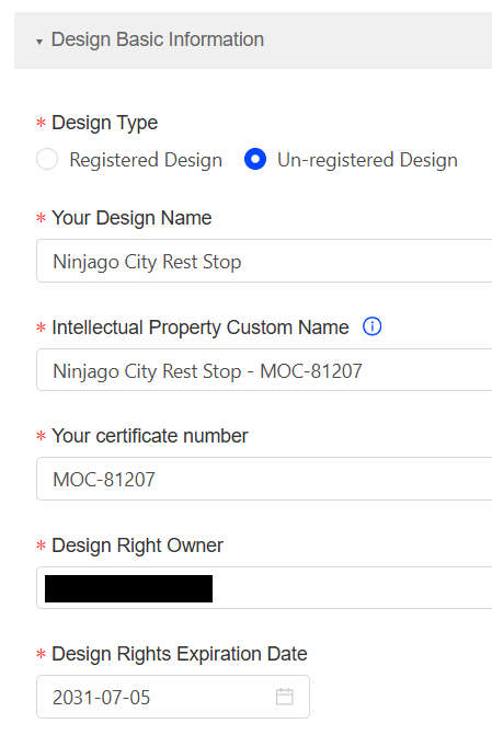 There are a few different IPR types to choose from. MOC designers have had success using an unregistered design as the IPR type. If your MOC is older than three years, you may need to use a copyright or other IPR type. The following steps assume you are submitting an unregistered design, but will be similar for different IPR types.