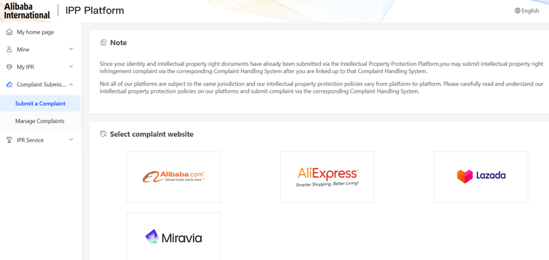 Finally, once the IPR is confirmed you can report the listing. Click Complaint Submissions > Submit a Complaint, then select AliExpress.