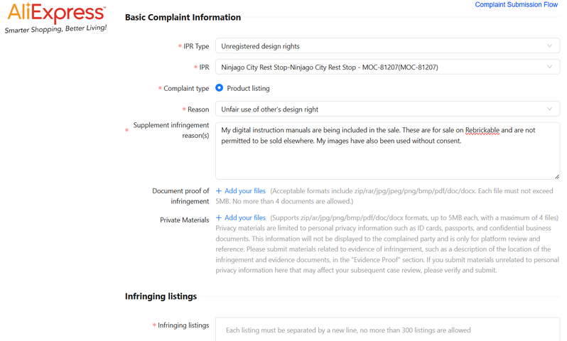 This opens an AliExpress specific complaints form. You can choose the IPR type and item from drop down menus based on what IPRs you have approved. Add a description for why you think it should be taken down. Paste the link for the listing in the box at the bottom and click validate. For the proof of infringement I simply uploaded the main MOC image again. I didn't add any private materials. I would advise against uploading your instruction files to this platform. This is not normally required to have a listing removed.