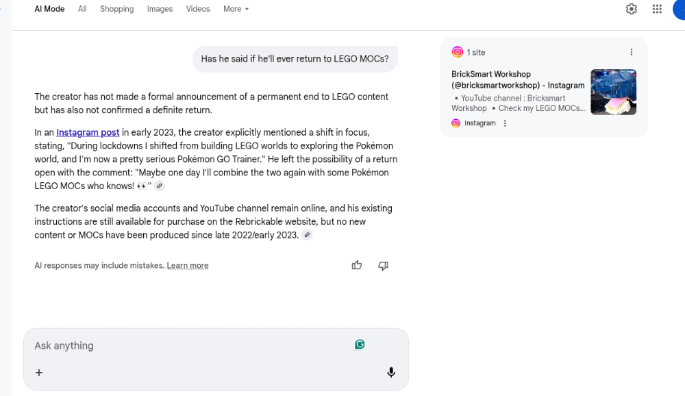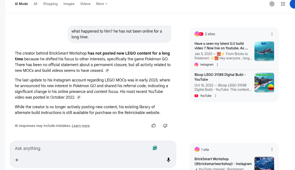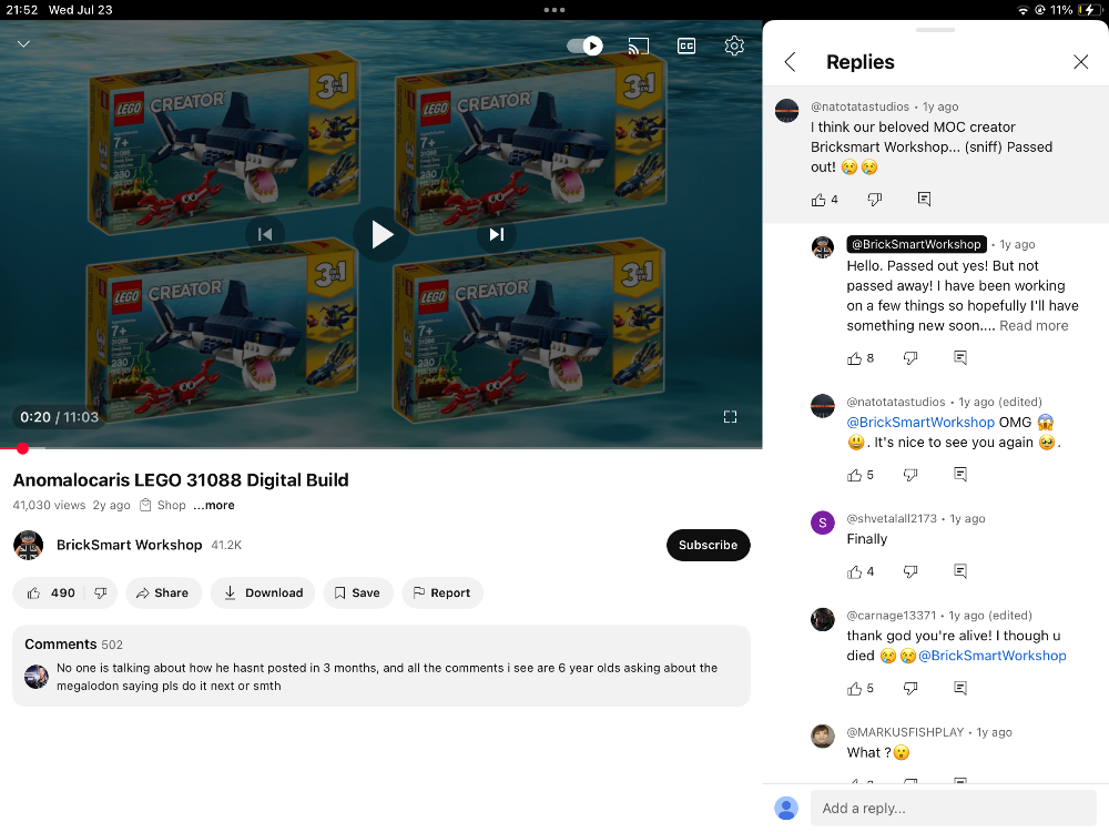 I remembered when this guy carried me from 2021. During that time I was getting burnt out from life and transitioning to an adult and Legos was one of the few things that I still like today. I remembered when during the weekends I would be excited to build one of his mocs from Youtube when I got back from school. My personal favorites was Godzilla, Tiger Shark, Megalodon, etc. I'm kinda sad he doesn't post anymore, but if you're reading this: Thank you for the memories! <3