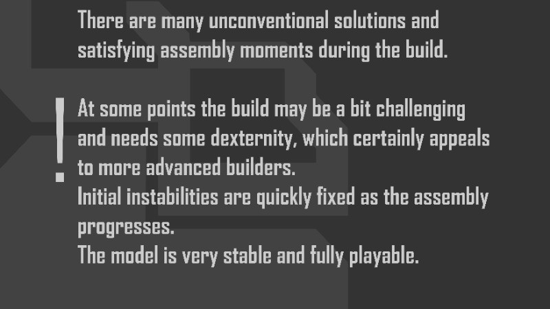 There are many unconventional solutions and satisfying assembly moments during the build. At some points the build may be a bit challenging and needs some dexternity, which certainly appeals to more advanced builders. Initial instabilities are quickly fixed as the assembly progresses. The model is very stable and fully playable.