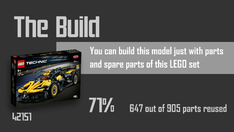 The build: - You can build this model just with parts and spare parts of the LEGO set 42151 - 647 out of 905 parts were reused, which is 71%