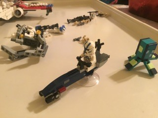 This is a little speeder from the clone and droid battle pack. It is great for bases and doesn’t need much room.with the remaining parts you can build a stand.