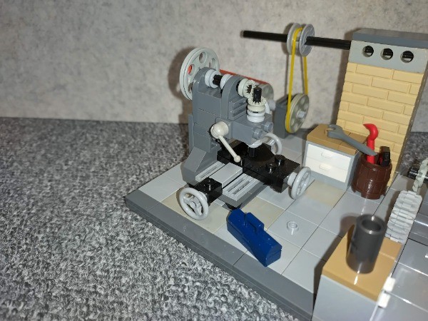 For this MOC, I have created such a two piston steam engine, like they were used in this period. The engine is a fully fonctional LEGO Pneumatic Engine (LPE) and drives a line shaft. This shaft drives a lathe and a milling machine in a small locksmith workshop. Each machine has a serveral stepped roller system in order to have several speeds levels for the machines.
