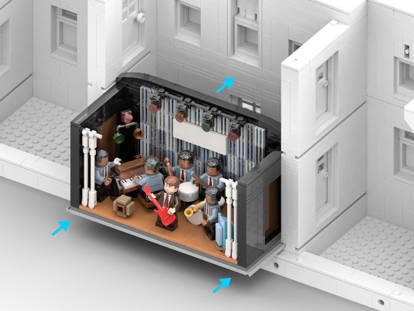 Thanks to this system, the Hill Walley Courthouse & Clock Tower can be quickly transformed into the building from the second part of the movie. All additions (Modern facade in the middle, and interiors) will be designed by me this year. In the middle part where Marty played the guitar. If you have any ideas what you would like to see in the 4 remaining rooms - write in the comments.