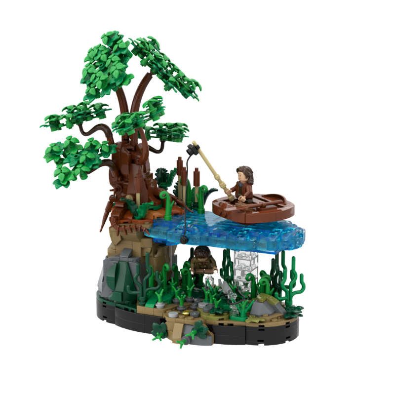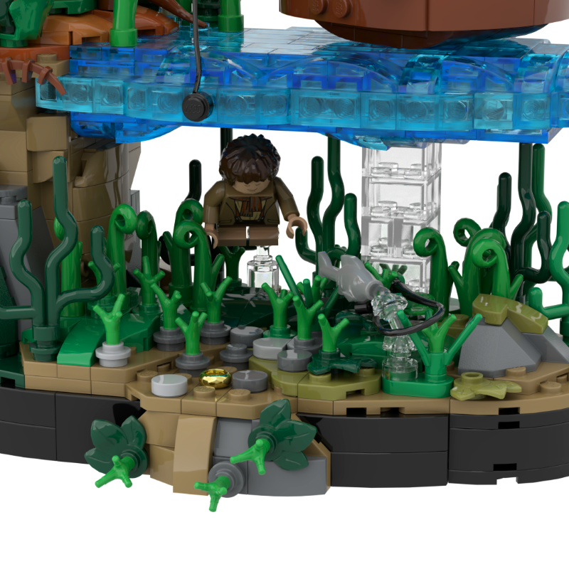 the one ring in the the muddy waters between and underwater greenery, a new bigger tree (compared to my GWP lusher tree moc) on the coast and parts of the river with a new boat with smeagol
