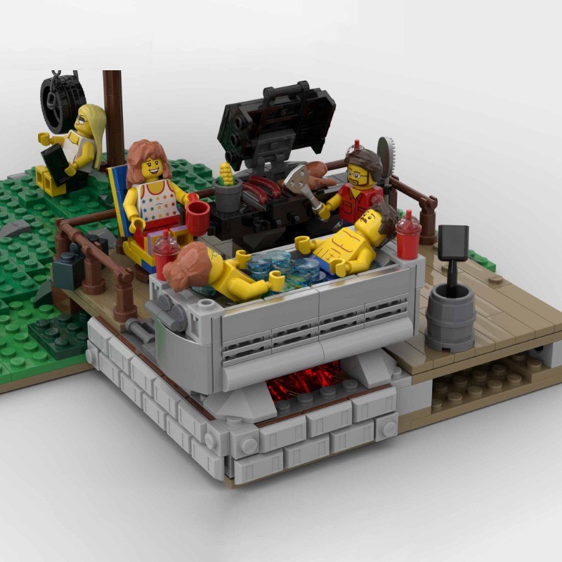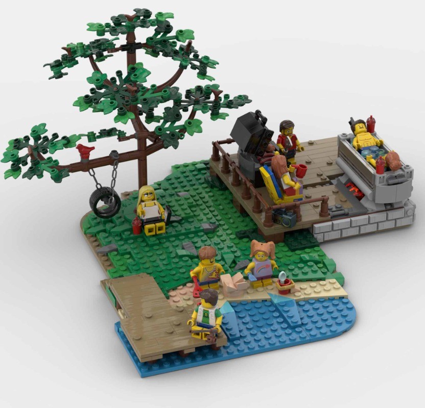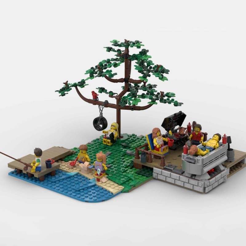 Take your A-Frame Cabin to the next level with this expansion MOC! Expand the deck to the right of the house with a grill masters dream BBQ and a redneck hot tub! Create engaging stories with the tree and tire swing, the small beach and the pier.