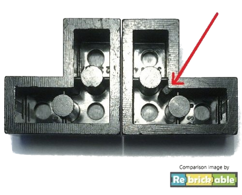 The mold comparison image shows both versions. As long as we are unsure when the mold change happened, we cannot create different parts for these molds. There is also another, seemingly older mold version without the diagonal wall in the inner corner.